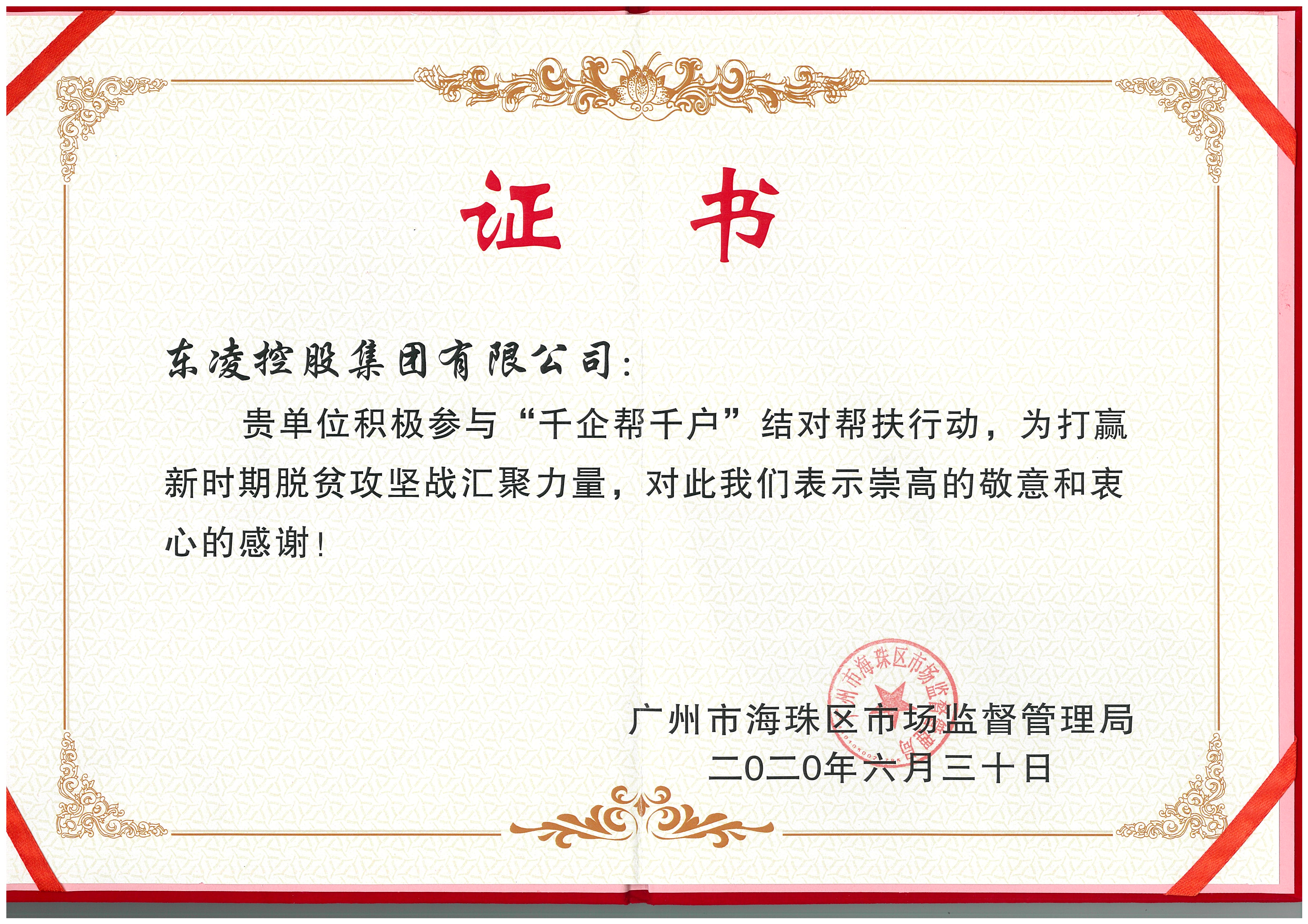 千企帮千户”结对帮扶行动证书